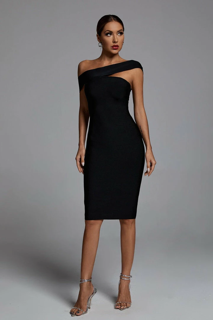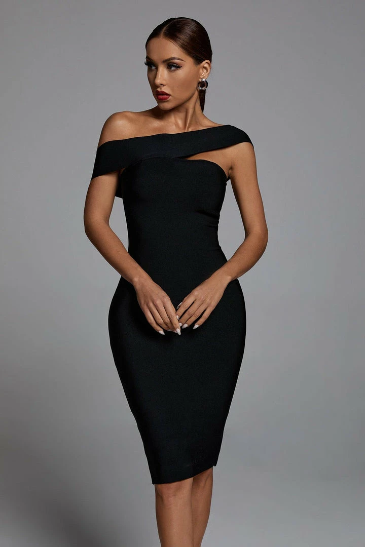 Hit the town in the Afare Off Shoulder Cocktail Dress! Medium-weight bandage fabric creates asymmetric, off-the-shoulder neckline and midi lenghth. This dress just flatters your curves perfectly!