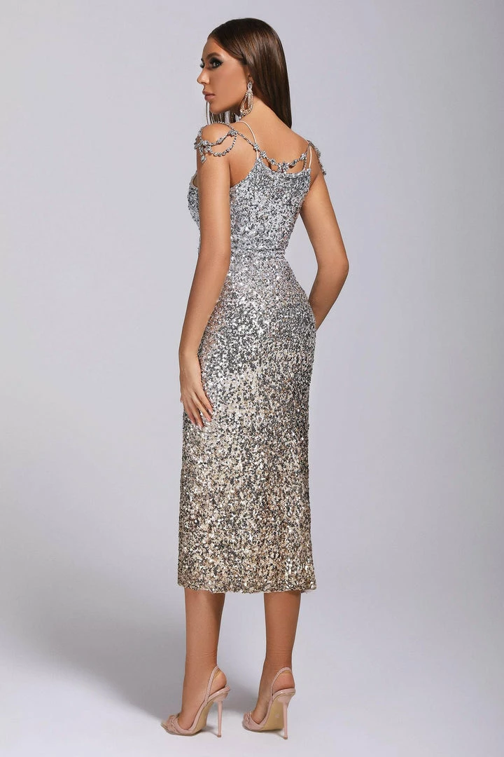 Exquisite Briella Sequin Diamonate Maxi Dress will sparkle unbelievably at your social occasion! Medium-weight, sparkly silver metallic fabric shines across a V neckline and midi length bodice. You can keep it classy by styling with heeled mules and a clutch bag for an outfit that packs a punch.