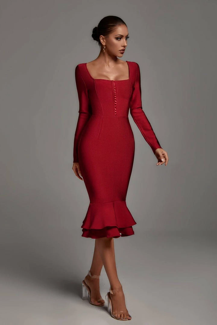 No matter the occasion, the Adriana Micro Midi Bandage Dress is sure to impress! Elastic rayon fabric shape a sultry square neckline, long sleeve bodice, and figure-flaunting bodycon midi skirt. Umbrella hem gives this little party dress some seriously romantic vibes! Complete this look with a pair of earrings and high heels. Easy put on/off. Hidden back zipper/clasp.