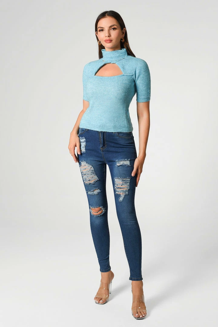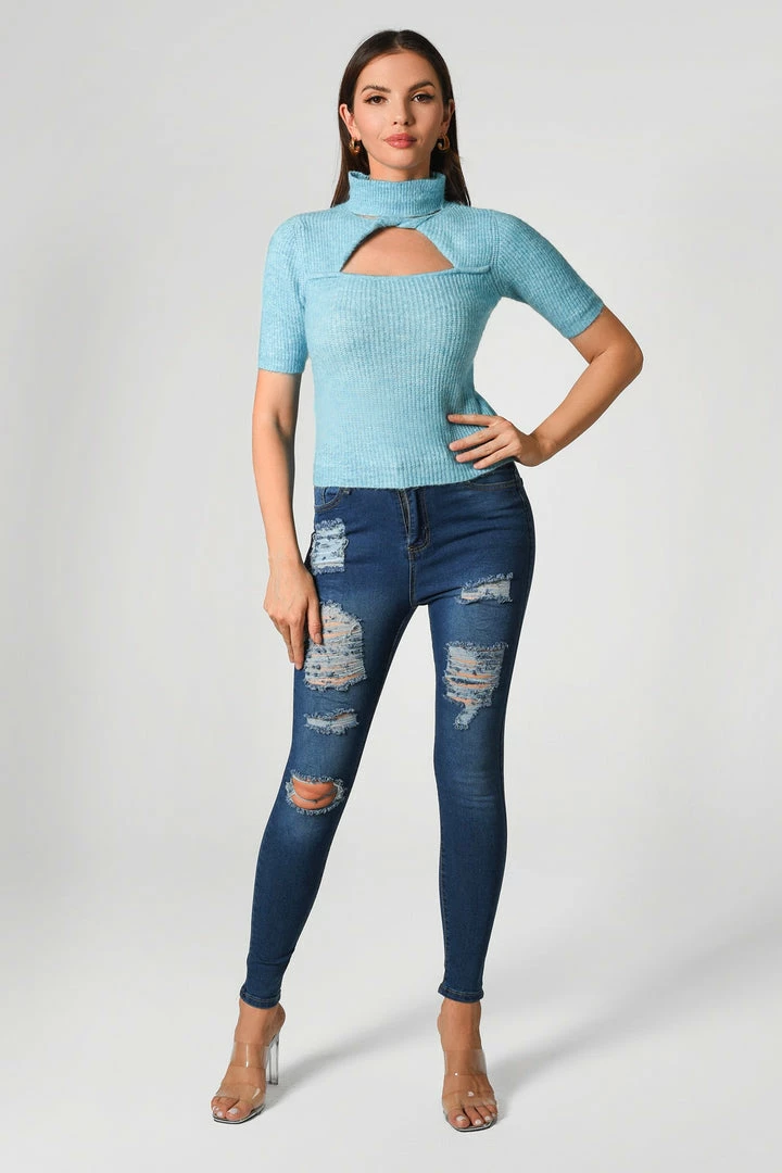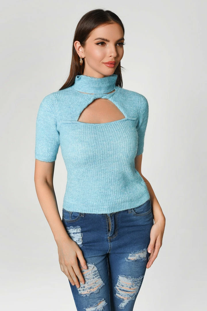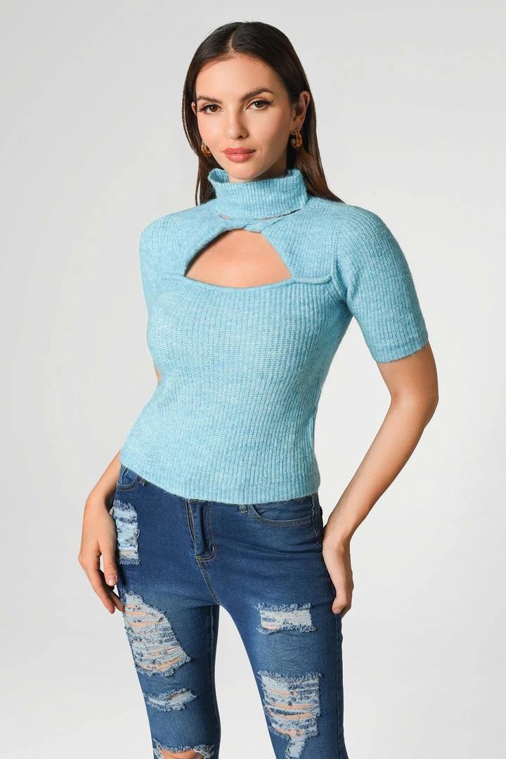 The looks that the Cutout Knit Top is serving up are anything but average! Knit fabric shapes a high mock neckline, short sleeves, and a fitted bodice with a keyhole cutout. Complete the whole look with a pair of casual jeans.
