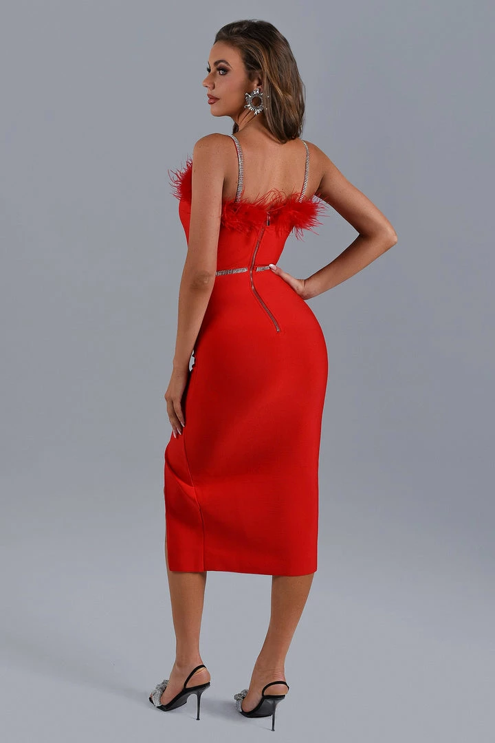 The remarkable Dana Feather Slit Midi Bandage Dress is the perfect frock for any occasion! The feather design on the chest and the small slit at the hem make the whole dress elegant and touching. Perfect with stiletto heels and a mini bag.