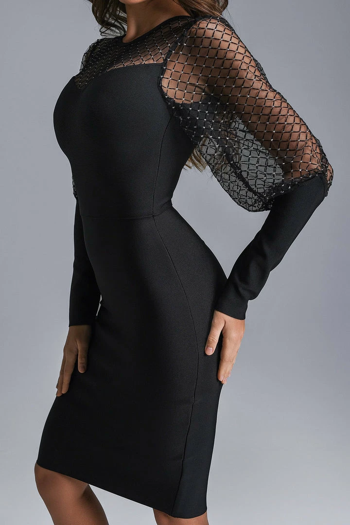 The Gudrun Diamonate Mesh Midi Bandage Dress will leave you positively spellbound! The mesh fabric creates the unique sleeves of this dress, which embraces the curves of your body in just the right place. Simple and fashionable style is very suitable for various occasions. Opt for an elegant look with shiny earrings or a brightly colored bag.