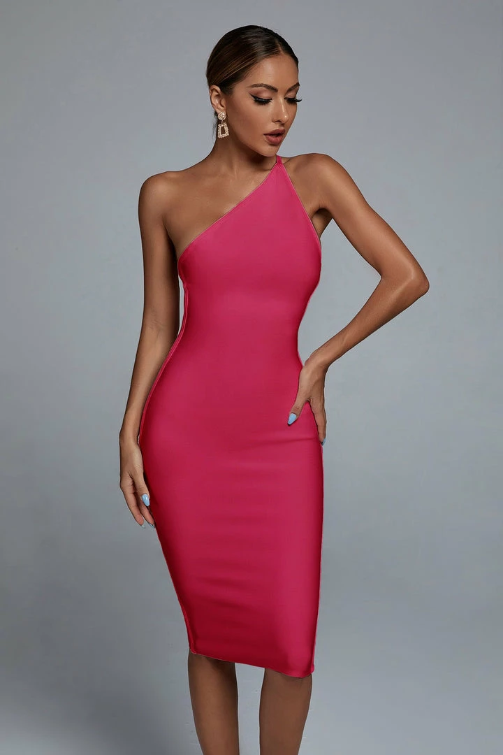 Vibrant hot pink tones and silhouette enhancing midi length cut. Love the one-shoulder cut and figure flattering low cut back. This mini party dress will have you turning heads on your next occasion, babe.