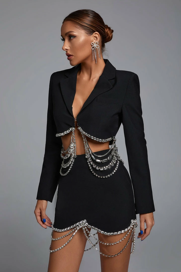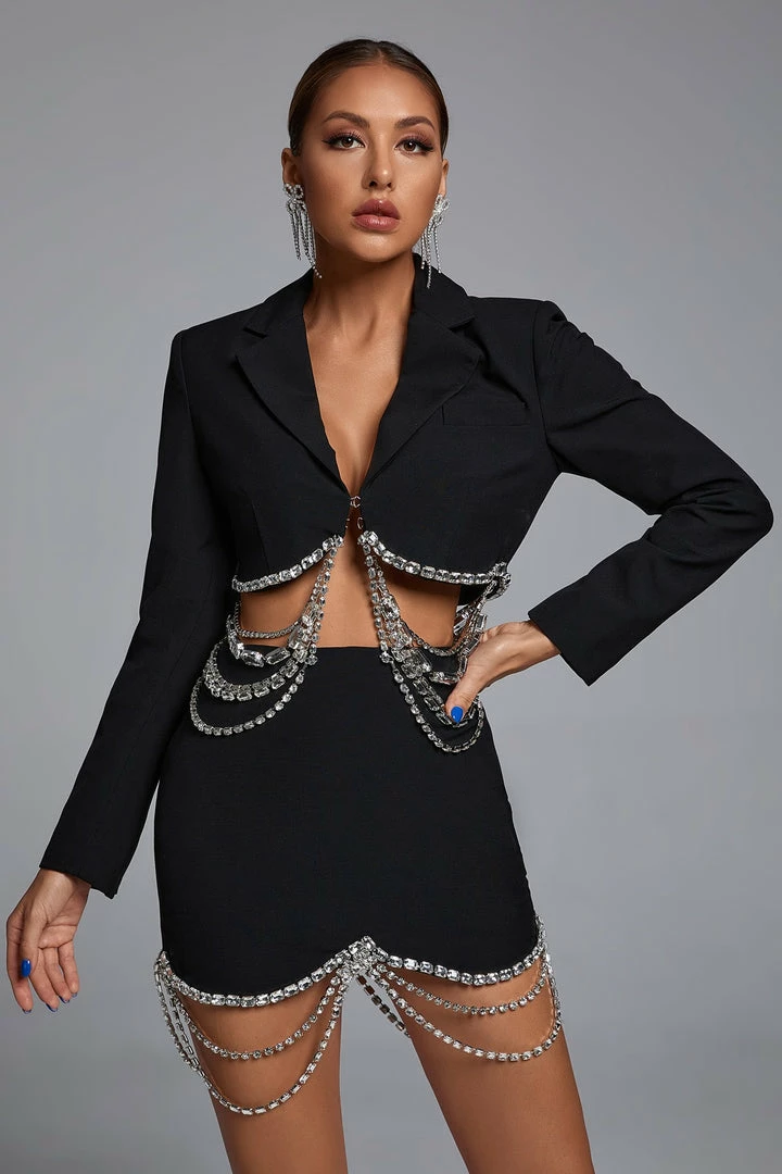 The compliments won’t stop rolling in when you’re wearing the crystal set! The dress is adorn in diamante which is so shiny and eye-catching! Pair with long earrings and high heels and head out for the night!