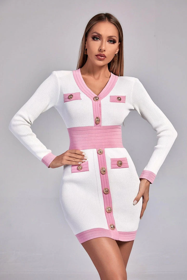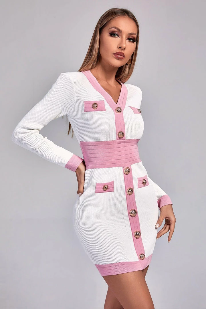 White and peach pink stitched knitted long sleeved dress perfectly shapes your body. The golden buttons enhance the texture of the homecoming dress and highlight your noble and elegant temperament. Simple and generous design makes people never get tired of it. Let it accompany you to attend all kinds of occasions! Easy put on/off. Hidden back zipper/clasp.