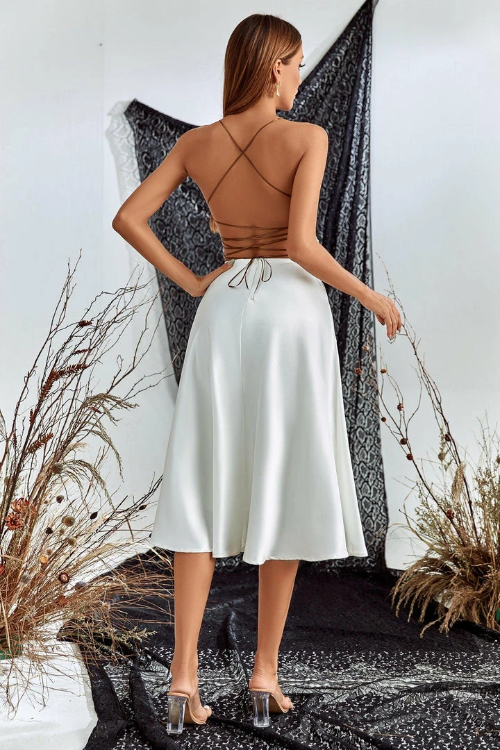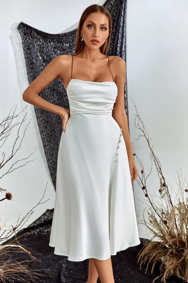 Let the night be all about you looking chic in the satin slit midi dress! Silky stain shapes a strapless, princess-seamed bodice with an elasticized back. The cross bandage design at the back is pretty sexy and chic. The buttons on the skirt can be untied to reveal your slender legs. We’re completing the look with a pair of earrings and high heels.