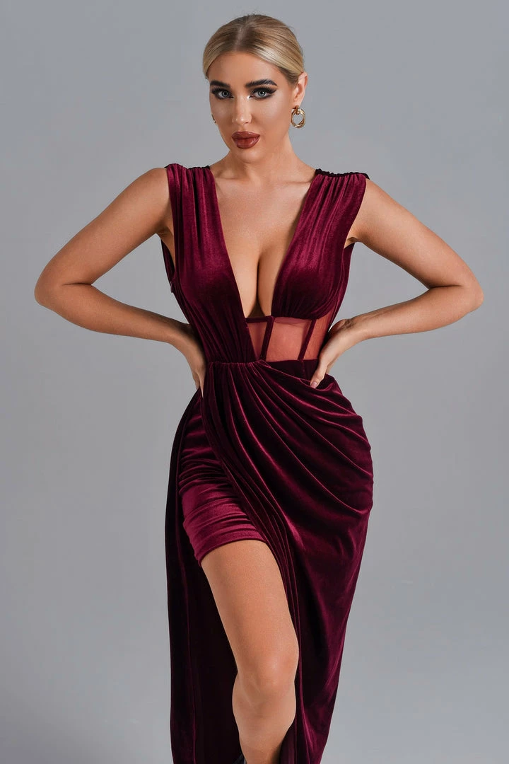 The compliments won’t stop rolling in when you’re wearing the Saffron Velvet Maxi Dress! Velvet fabrics create a glamorous evening dress with front and back V necklines and a skirt inside and a floor-length outside. The mesh design at the bottom of the chest side adds a sexy vibe just right. Complete the look with stiletto heels and a shiny mini bag.