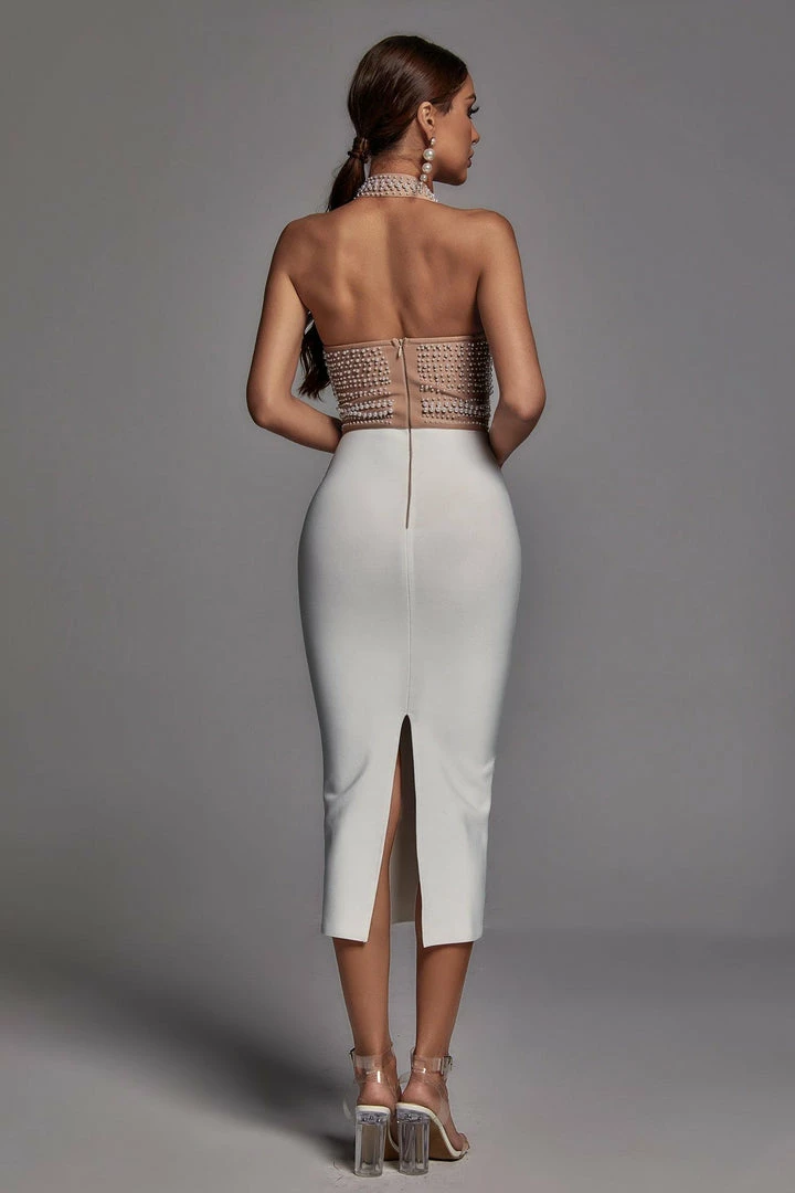 Cornelia Pearl halter dress is an ultra-sexy, bodycon-fitting dress complete with a halterneck, bandage fabric base, midi length, and stunning pearl detailing. Pair with your favorite heels and earrings to complete the look.