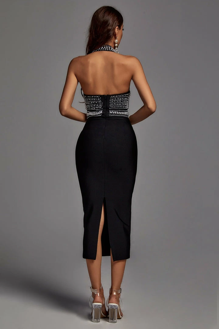 Cornelia Pearl Halterneck Bandage Dress is an ultra-sexy, bodycon-fitting dress complete with a halterneck, bandage fabric base, midi length, and stunning pearl detailing. You can also add it to the list of your party dresses. Pair with your favorite heels and earrings to complete the look.