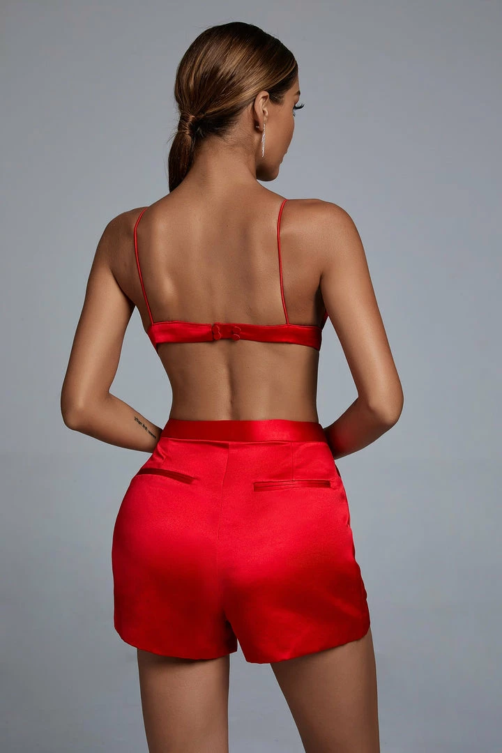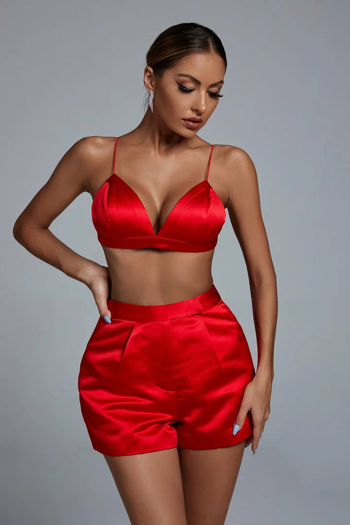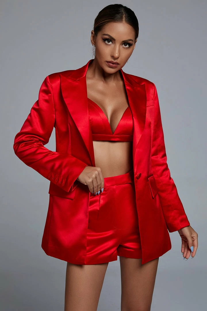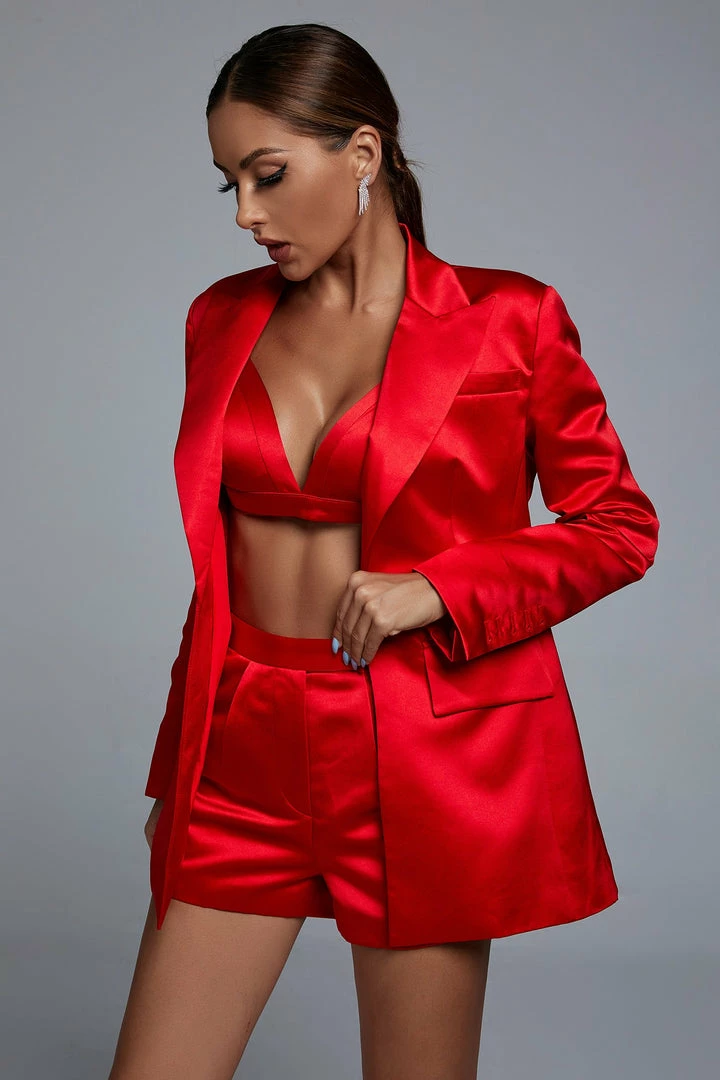 The Deana three-piece set is a must-have! this style is sexy and classy with a twist. It features a satin blazer with a matching top and shorts, perfect for a night out.