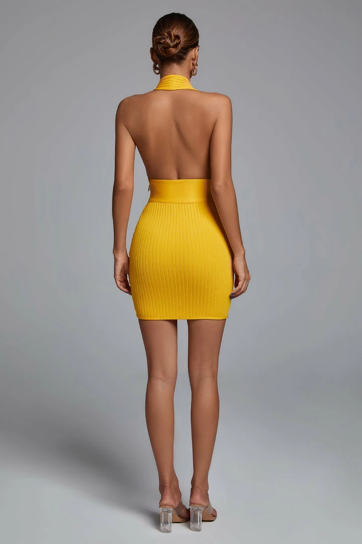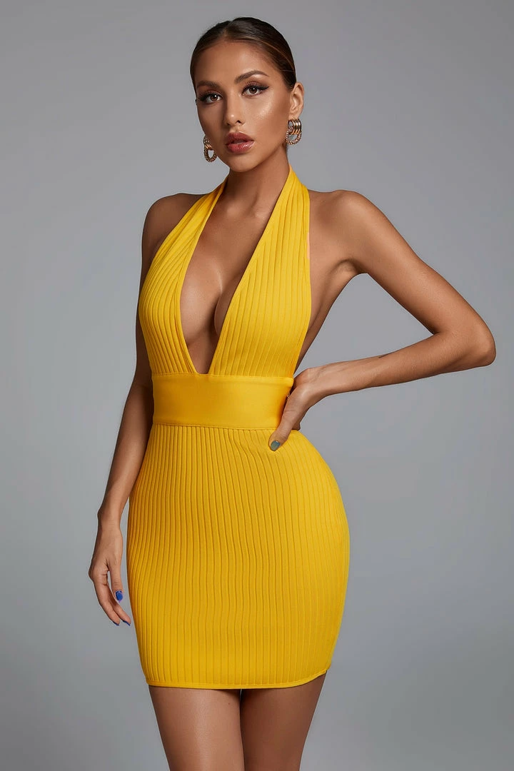 The Emmet Tangerine Bandage Mini Dress features a Halter neck, backless design and a cinched waist design. Made with a ribbed bandage material this sleekly-to-touch dress is perfect for a night out. Pair this party dress with heels and accessories for an easy but fabulous look.