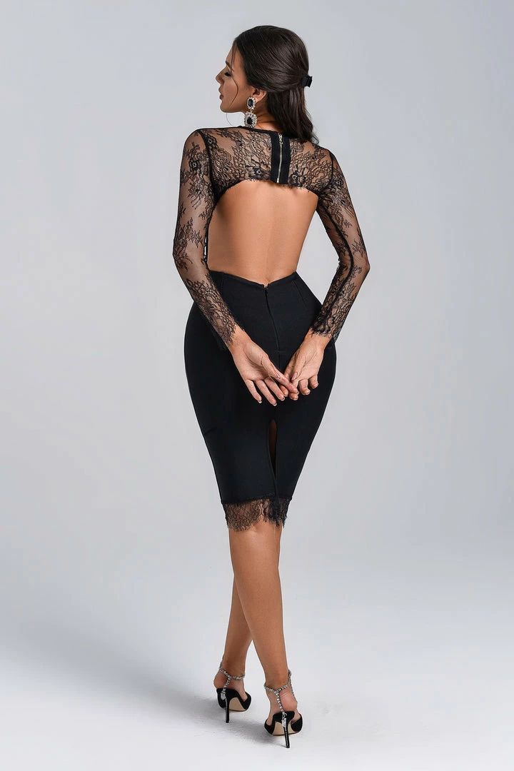 This lace backless mini dress will make a romantic out of you! Intricate floral lace shapes this sweet party dress that features a rounded neckline, darted bodice, and sexy open back framed by sheer long sleeves with eyelash cuffs. We’re completing the look with a pair of earrings and high heels. Easy put on/off. Hidden back zipper/clasp.