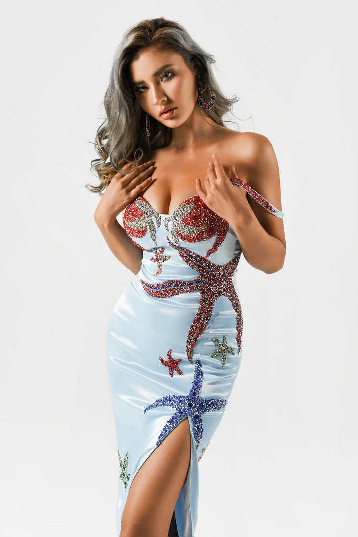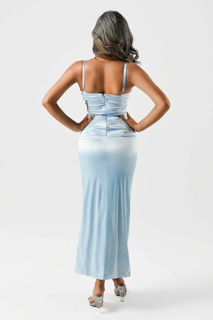 The Gilda Satin Diamonate Slit Maxi Dress will leave you positively spellbound! Gilda Satin Diamonate Slit Maxi Dress features a marine sequin pattern and a side slit. Pair with stilettos and your favourite mini bag for an unforgettable look.
