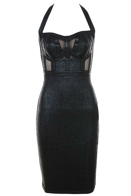 We can’t have a new collection without some bandages. Made with our new coated bandage this form-fitting bodycon has a wet leather effect, the new design has a sweetheart neckline and built-in cups for support. The sheer panels add a modest nude illusion while the draping armbands add an elegant touch. Pair with our favorite black pumps and let this cocktail party dress stand out on its own.