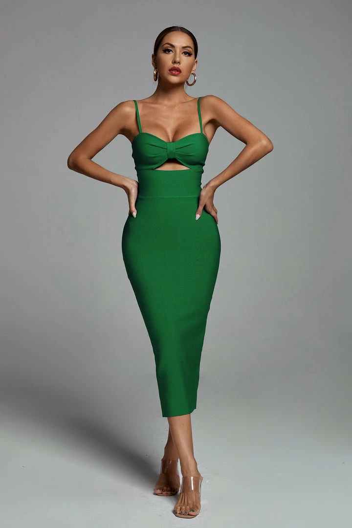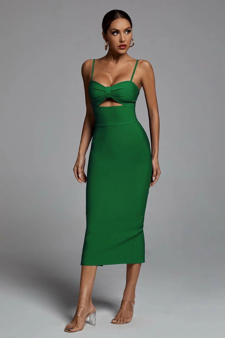 Make room in your wardrobe for this signature piece. Featuring cut-out details, curve enhancing lines, and gorgeous green. Made from our signature bandage fabric that holds you in & smooths you out. This party dress will have you turning heads at your next occasion, babe.