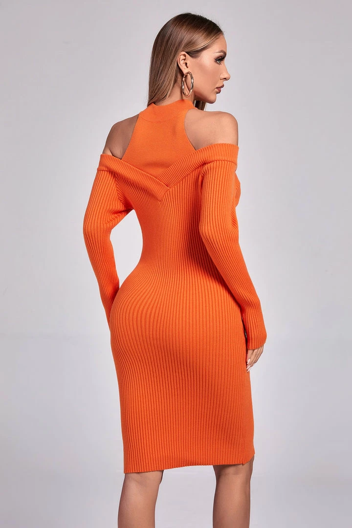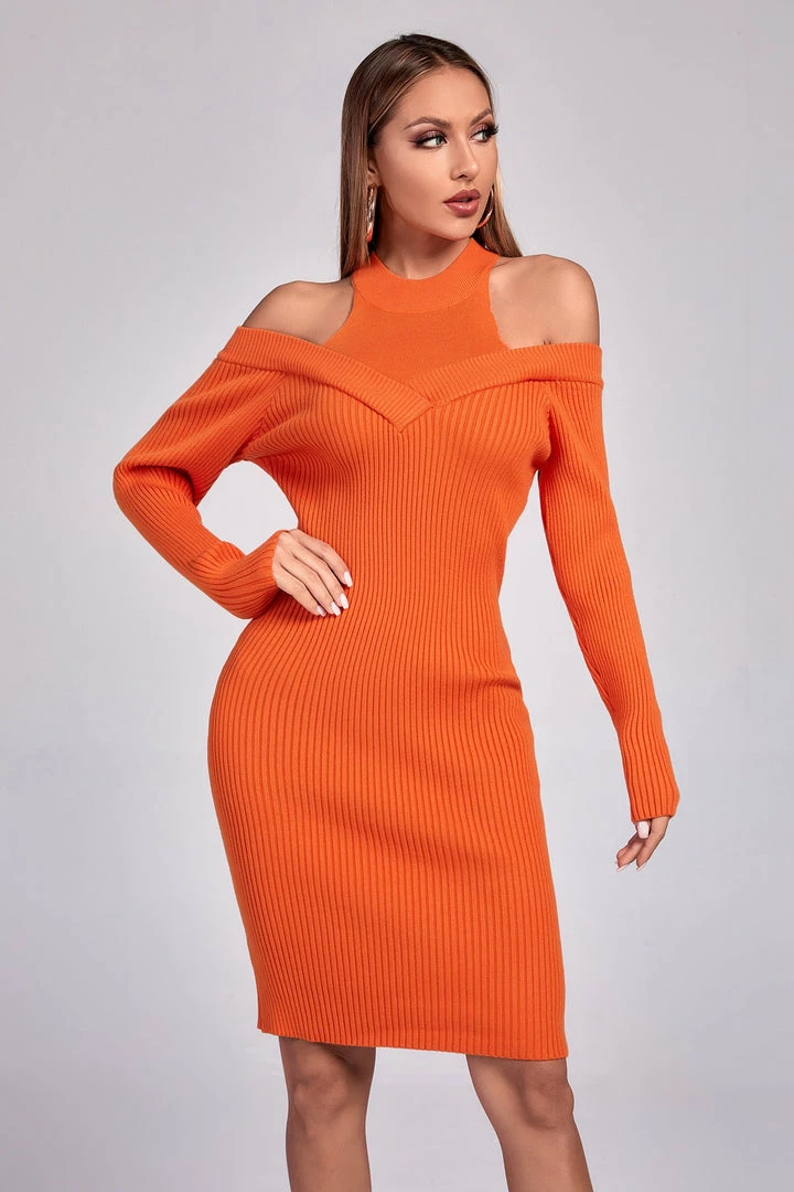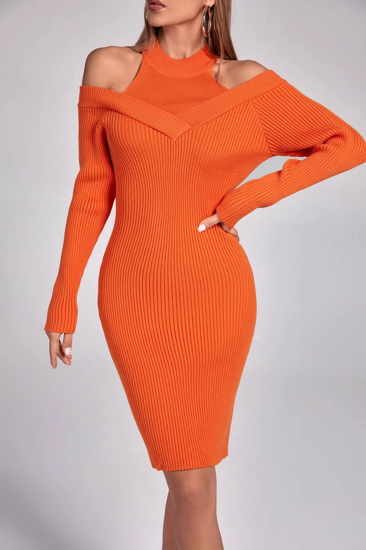 You’ll be cozy and cute in the Long Sleeve Cutout Sweater Dress! Stretchy knit makes up this adorable sweater dress with a round neckline and long sleeves with cold shoulders. Figure-skimming skirt falls to a mini hem. We’re completing the look with a pair of standout earrings and high heels.