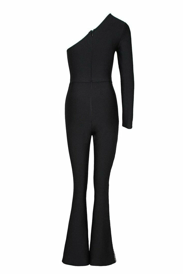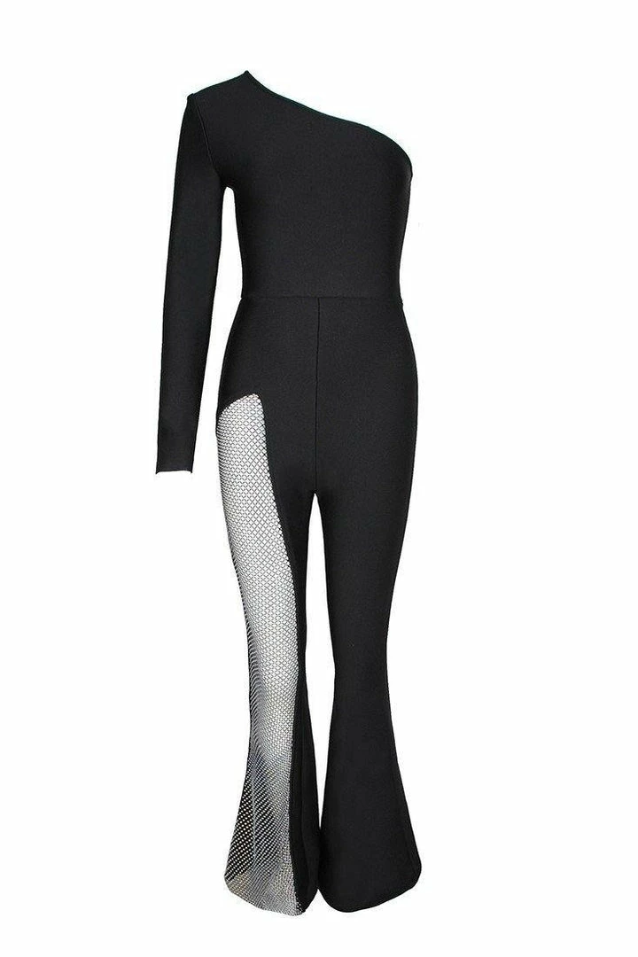 We’re obsessing over the Kanye One Shoulder Diamond Jumpsuit. Made of stretchy bandage knit fabric, this stunning single-shoulder styling jumpsuit also features a slant neckline, one long sleeve and a concealed back zip closure, and matching with a pair of bootcut bottom in a high-rise silhouette, semi-sheer meshlet from thigh to hem at one side. Pair with stilettos and your favourite mini bag for an unforgettable look.