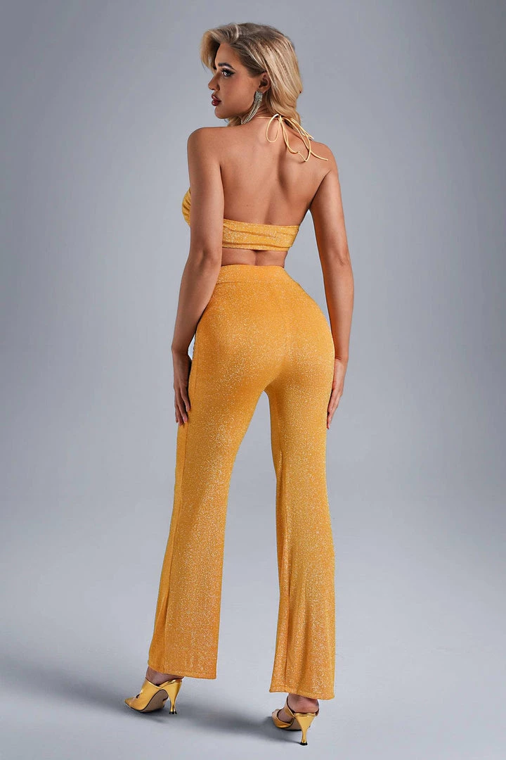 Show off your fashion forward sense and wear this glamorous style Kayla Set for your social occasion. Tight send cool and refreshing yellow small condole belt jacket, comfortable tight trousers formed the suit with infinite charm. You can choose to wear it on a vacation or summer outing, and you’ll be in a good mood for the day. Just match it with a pair of sparkling high heels to complete the whole look.