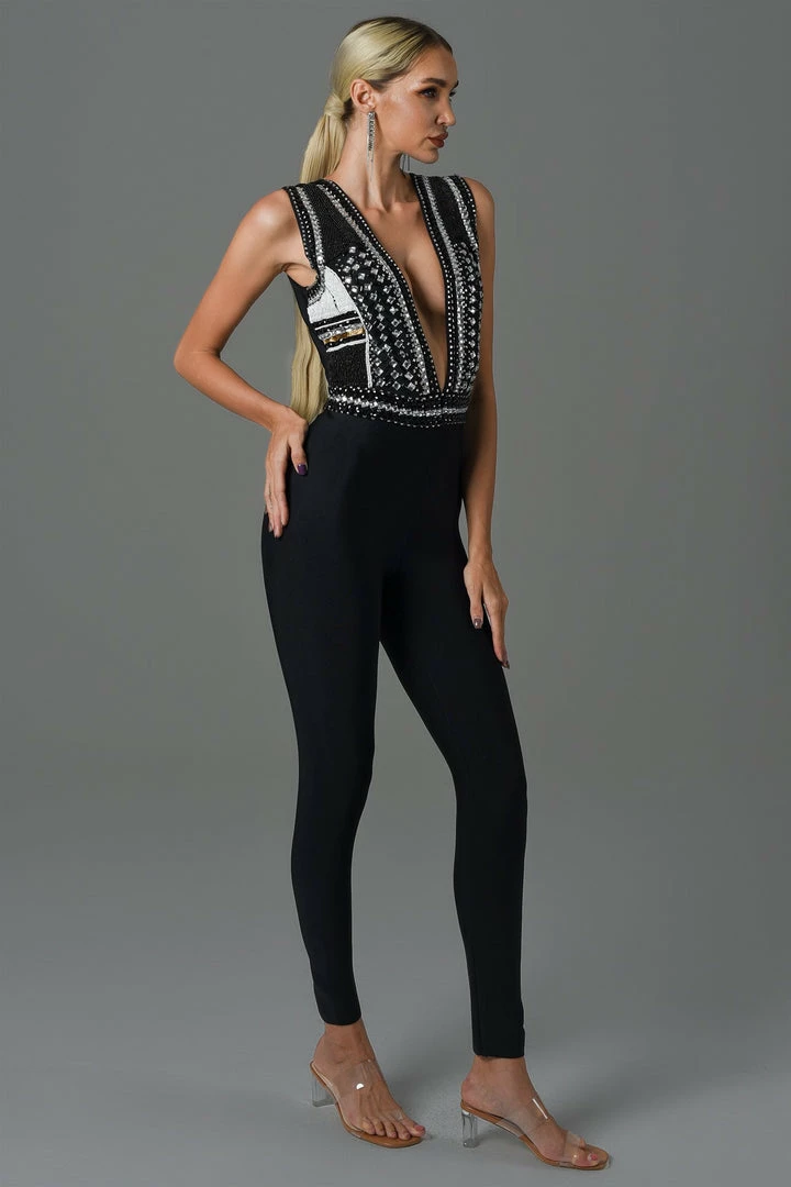 From prom night to date night, the Diamante Deep-V Bandage Jumpsuit can really do it all! The bodice adore in diamante and has a deep V-neckline that’s supported by two wide straps, a set-in waist. The fitted bodice tops long tapered pant legs that end at ankle-length hems. Pair with high heels and a chunky necklace for an ultra-chic look.