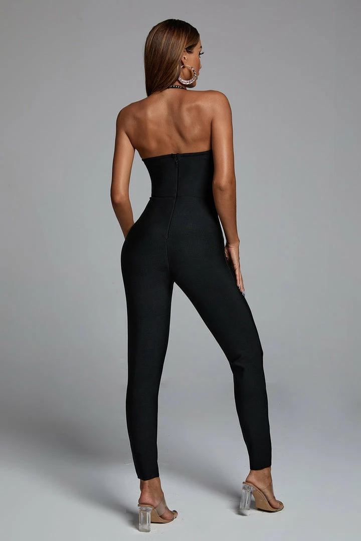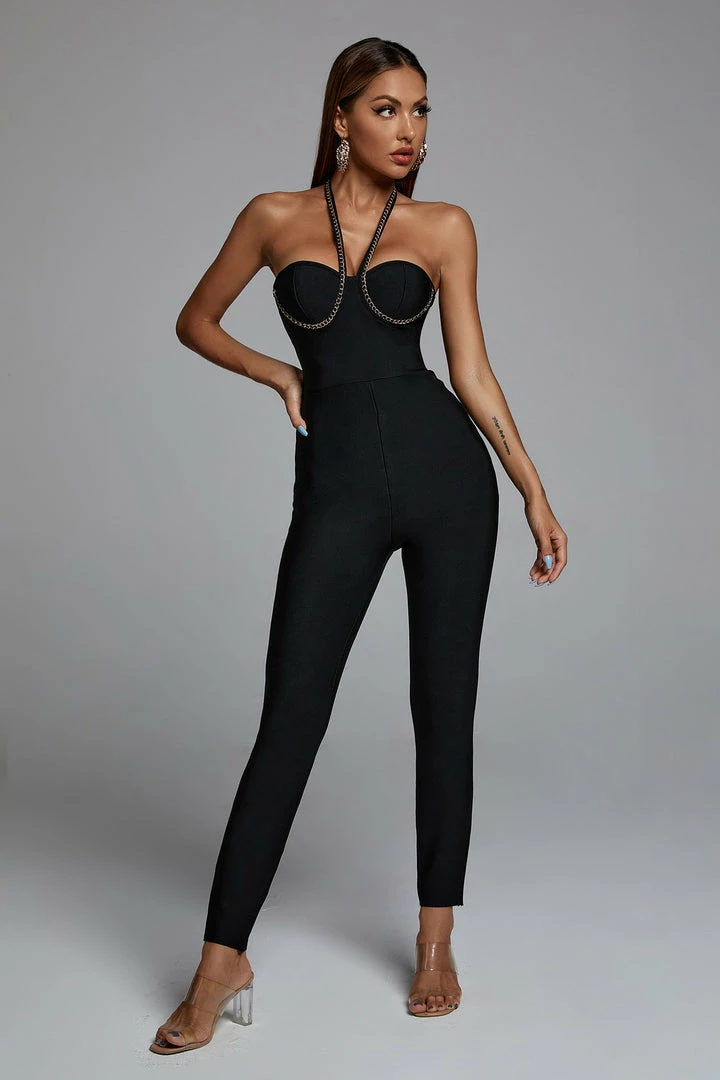 Show off your fashion forward sense and wear this glamorous style Kisaba Bandage Jumpsuit for your social occasion! stretchy knit covers a sexy, princess-seamed sweetheart bodice, a high, banded waist, and a halter neckline with metal chain. The fitted bodice tops long tapered pant legs that end at ankle-length hems. Pair with high heels and a chunky necklace for an ultra-chic look.