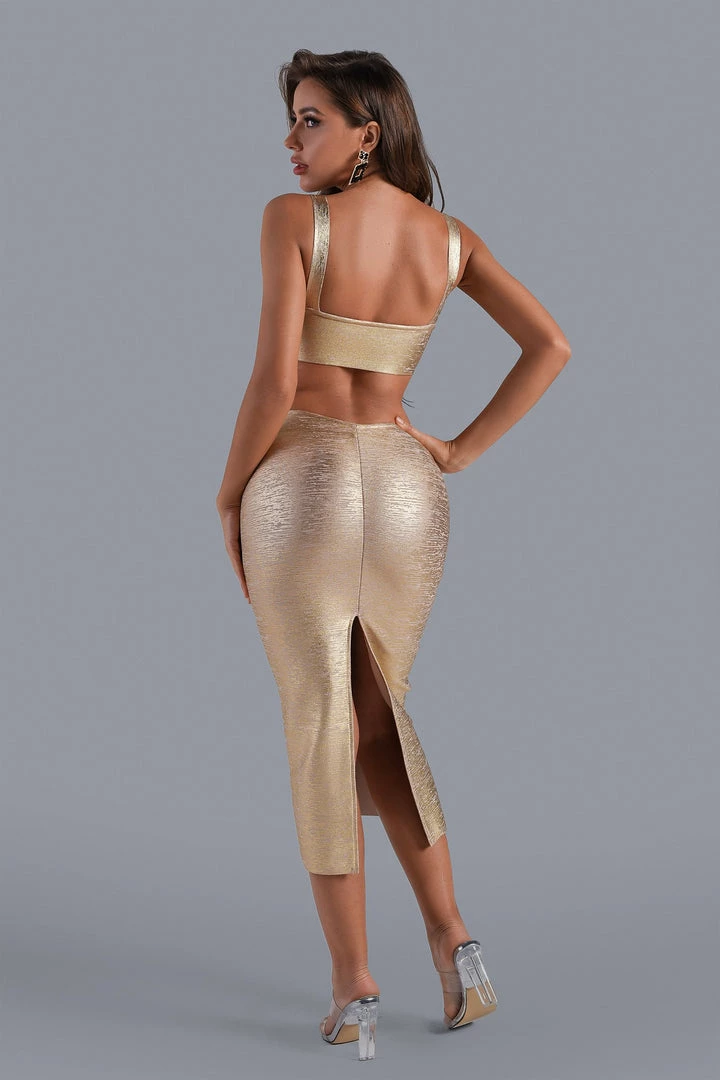 Let the night be all about you looking chic in the Kit Metallic Midi Bandage Dress! This figure-perfecting party dress with cut-out details is one of our absolute favorites in the closet. It’s crafted from bandage fabric to sculpt and shape the figure, acting like shape wear that is cleverly built into the dress. Pair with stilettos and your favourite mini bag for an unforgettable look.