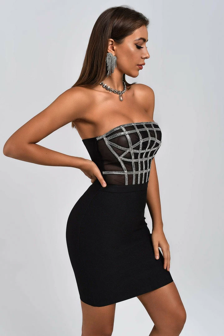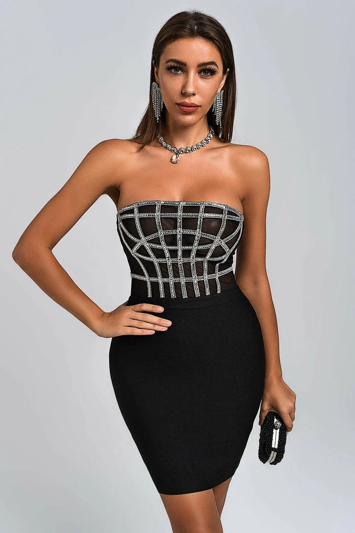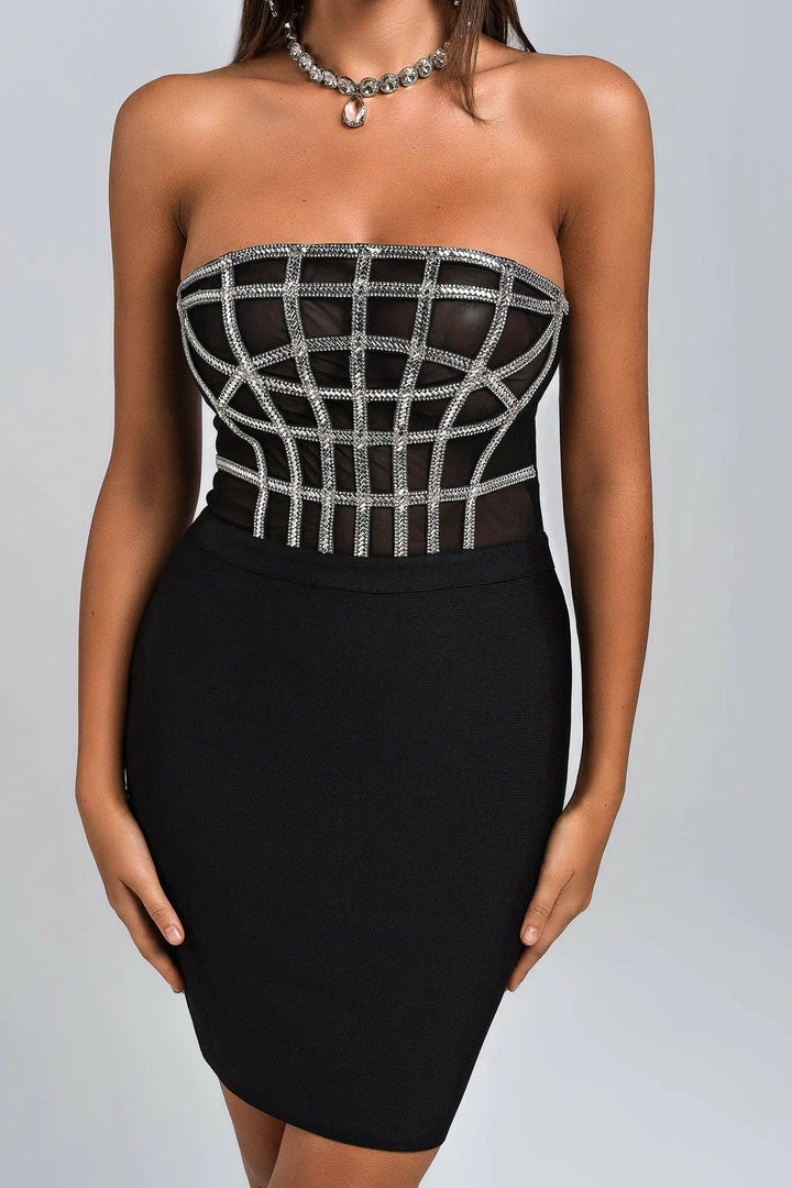 Show off your fashion forward sense and wear this glamorous style Liliya Diamonate Corset Mini Bandage Dress for your social occasion. It’s crafted from bandage fabric to sculpt and shape the figure, acting like shape wear that is cleverly built into the dress. Pair with stilettos and your favourite mini bag for an unforgettable look.