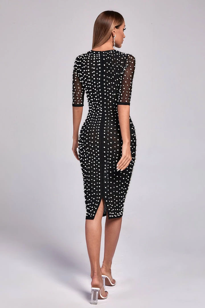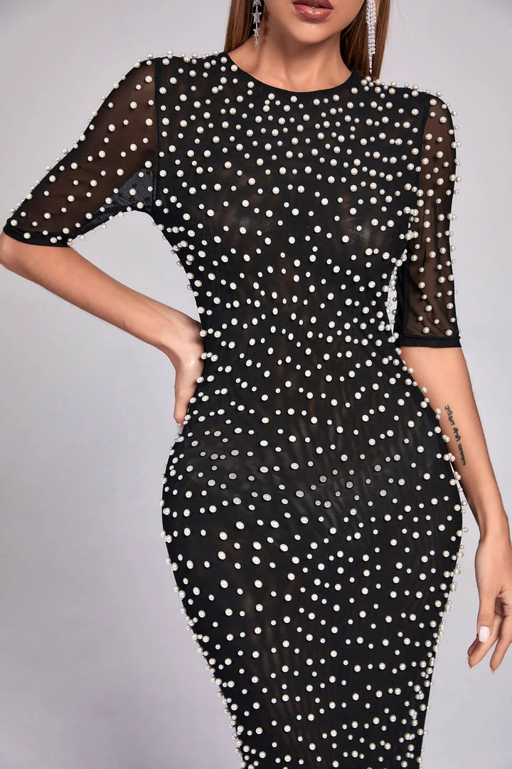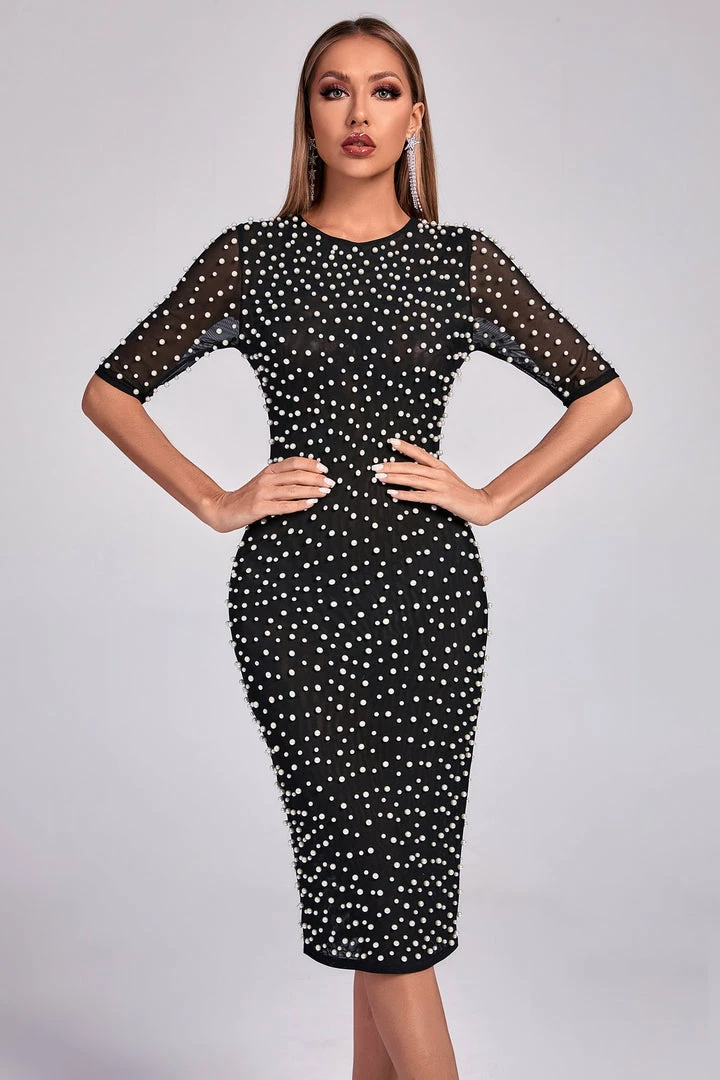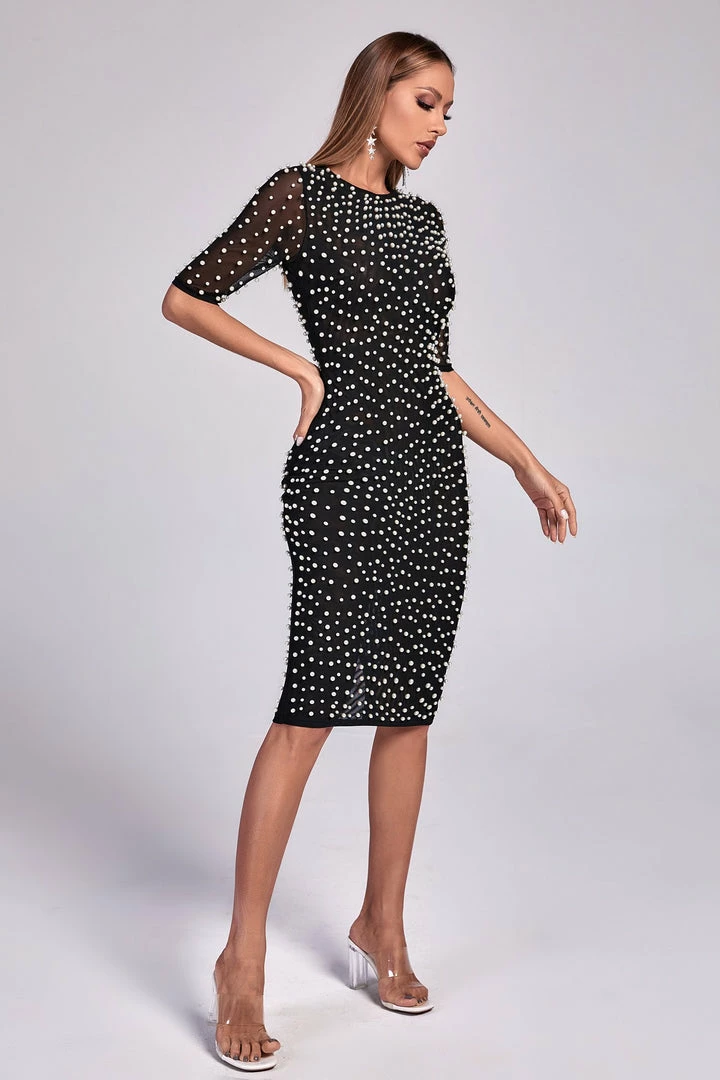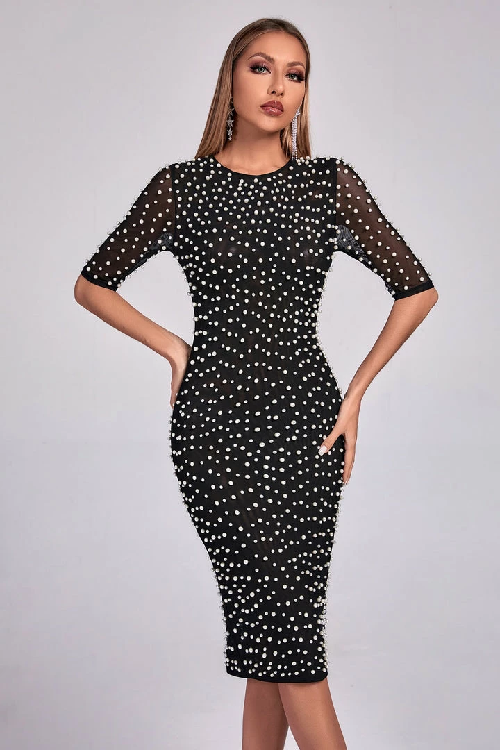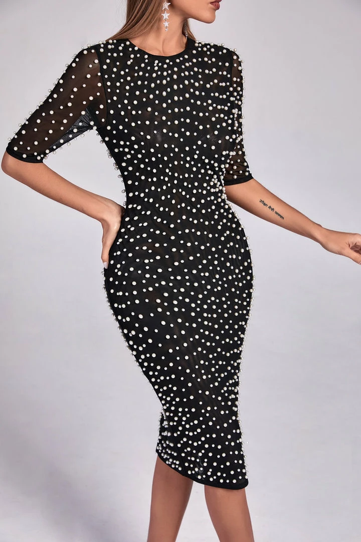 You’ll be a vision of elegance in the Lissy Bodycon midi Dress!The dress is adorn in pearl, which shapes this elegant party dress that features a rounded neckline, darted bodice, and mesh elbow sleeves. Fitted waist tops a bodycon skirt with a flirty midi hem. Hidden side zipper/clasp.