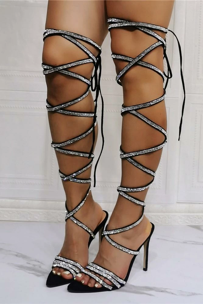 The Marissa Diamond Wrapped Strappy Heel serves up glamorous vibes with its faux suede base and stunning rhinestone gem overlay. Featuring a multi-strap upper, pointy open toe, skinny stiletto heel, and thigh high wrap around cords that circle leg, this killer sandal exudes a fierce and femme mood. Step out on the town in style.