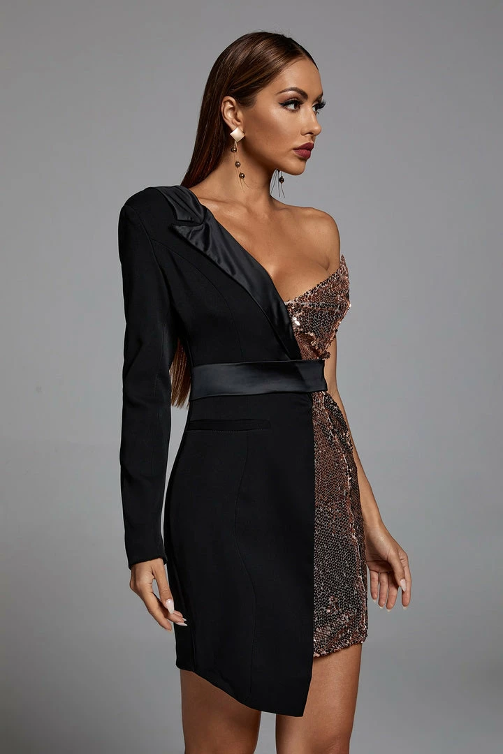 Made to draw attention, this half stretch sequin half satin crepe dress is sure to fit like a glove. With one sleeve and an open back its super breather able and easy to move in. The Gold Night is fully lined and made with an invisible zipper and clasp. Wear with a black pump for a polished look or a strappy sandal for a sexy spin. Either way this is sure to be a statement piece and have all eye on you!