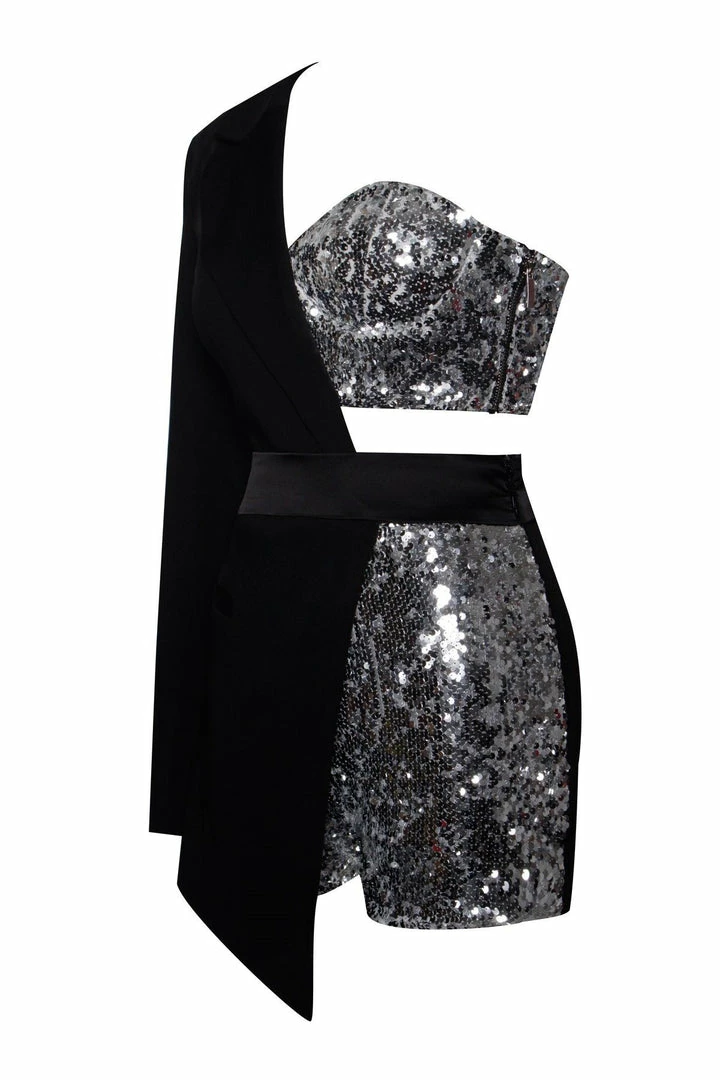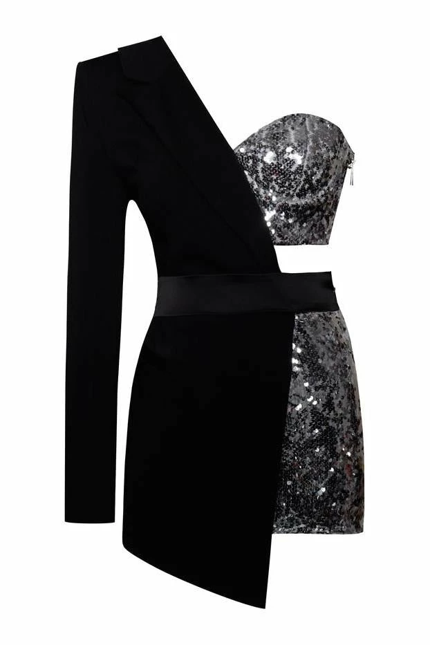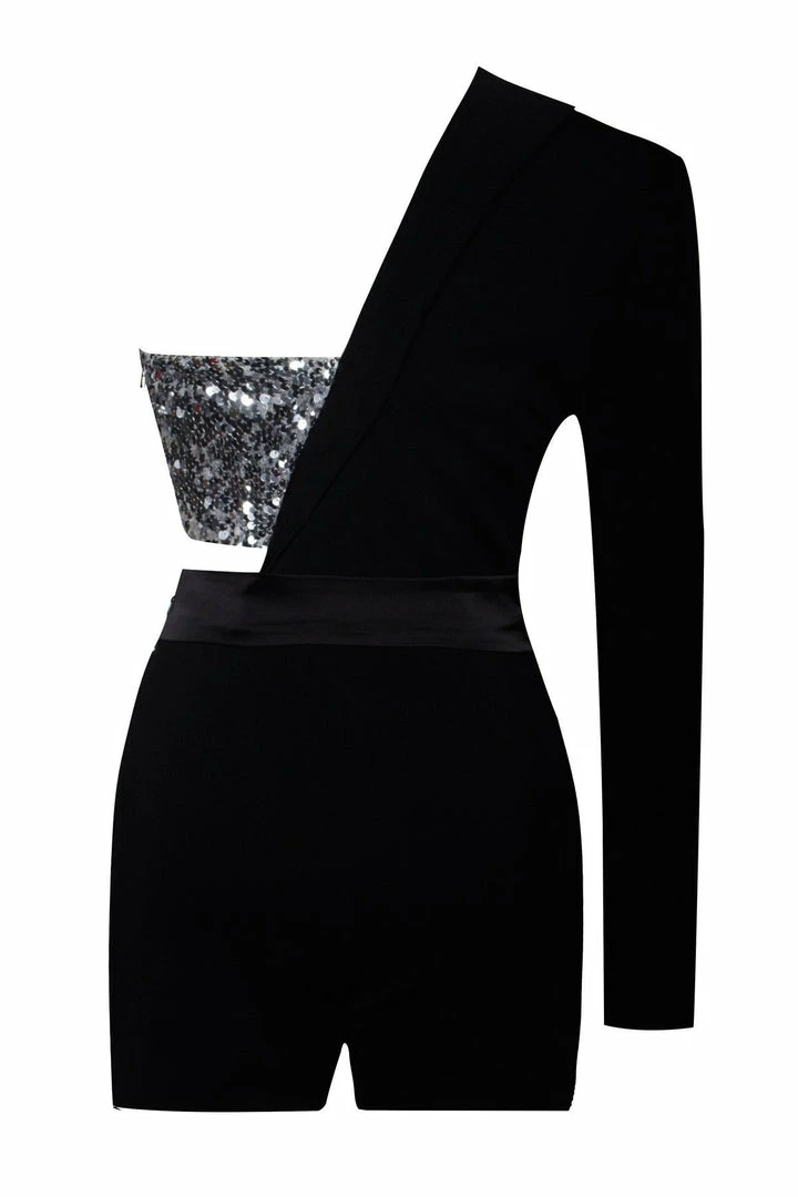Fall in love with this classy, yet sexy cut romper. This asymmetrical figure-hugging design was cut from our stretch crepe and features a matching satin belt. Fully lined with a hidden zipper on the side, Our one Sleeve Blazer Romper is a total must-have.Â