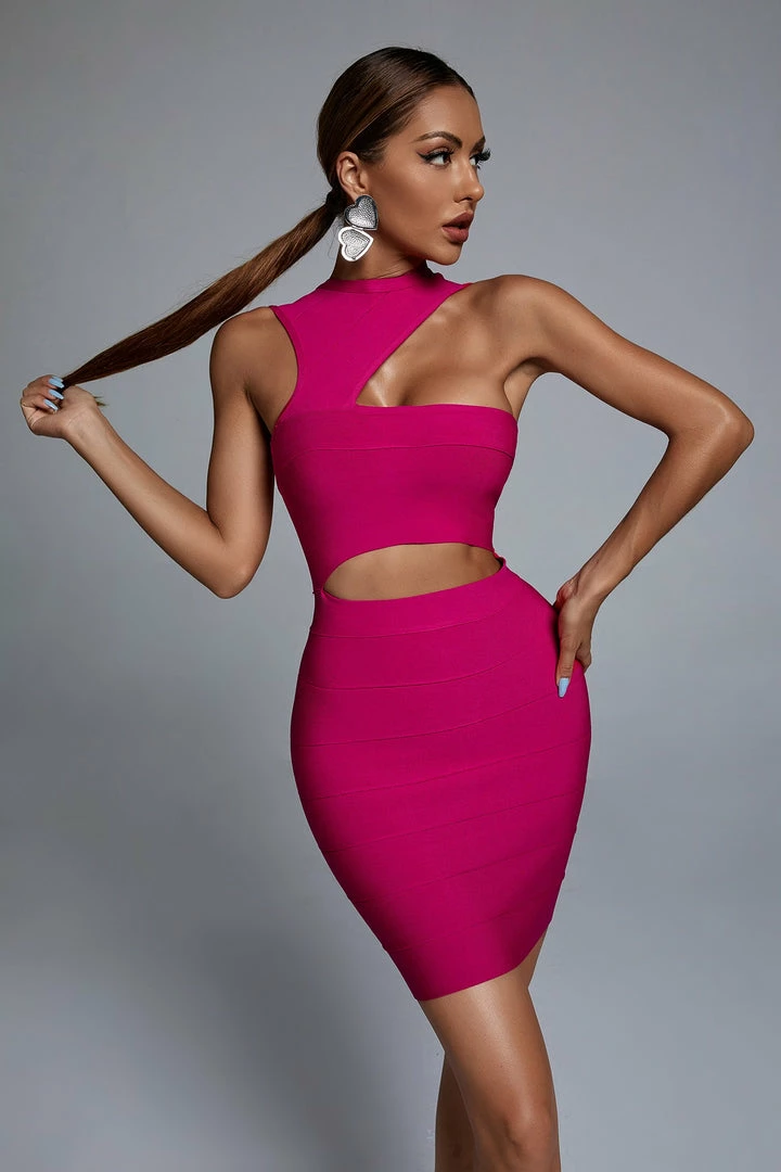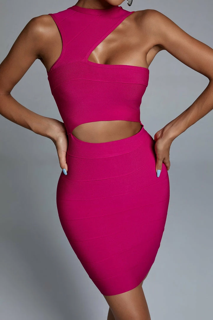 This figure-perfecting party dress with cut-out details is one of our absolute favorites in the closet. It’s crafted from bandage fabric to sculpt and shape the figure, acting like shapewear that is cleverly built into the dress.