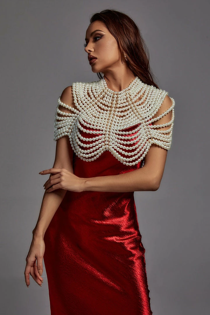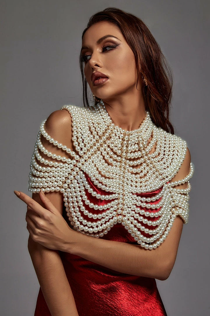 Get ready to look super chic in our Pearl Shawl Top. Featuring layered pearls from neckline to shoulders. Layer over your favourite dress for a chic look!