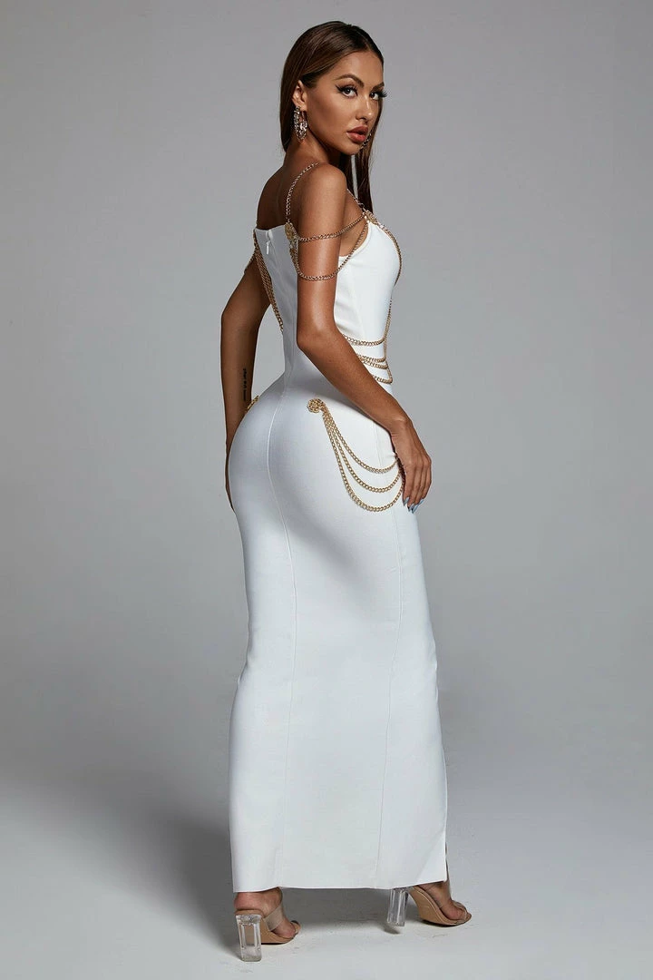 Metal Embellishment details add drama to this perfect dress. Sakina’ is constructed from our incredible bandage fabric and features Metal Embellishment details. Clever shaping creates curves and the maxi hemline is perfect for balancing the look.