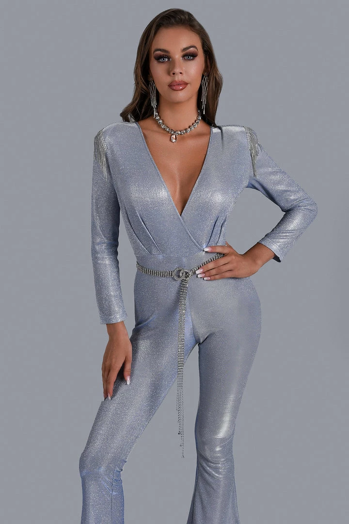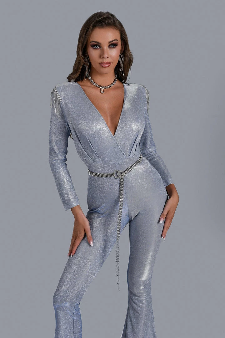 We’re obsessing over the Sally Jumpsuit. Medium weight, comfortable fabric in shimmering silver, long-sleeved jumpsuits make for a perfect day’s wear experience. The silver chain at the waist is the highlight of the jumpsuit. Put on comfortable shoes and go out.