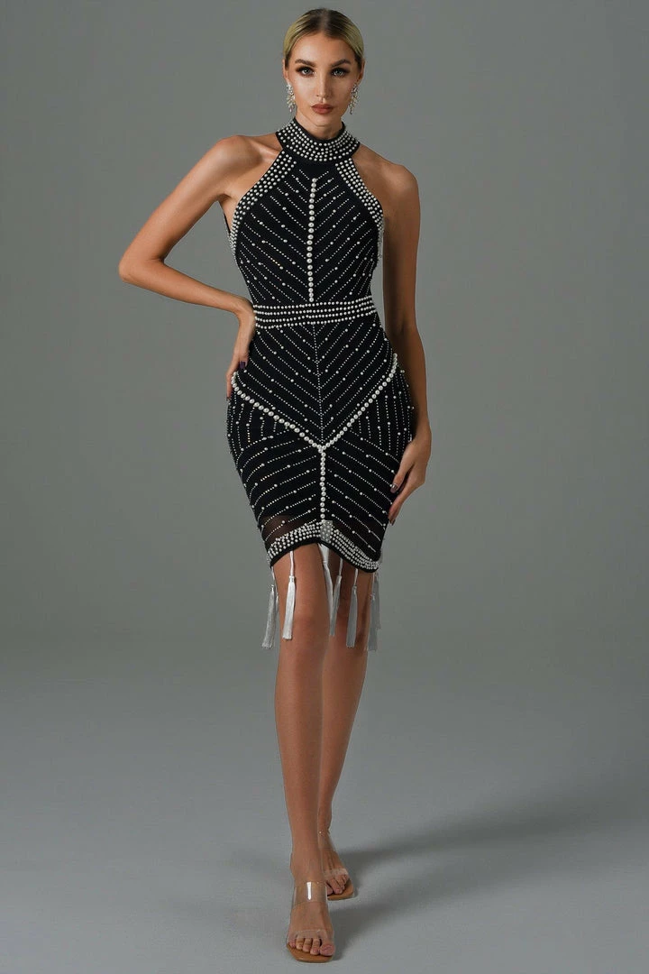 Kick off a rave party in this Thaliy Pearl Fringed Midi Dress! Hundreds of faux pearls embellish this midi dress to add glamour and sophistication. The midi dress features a sleeveless silhouette with a halter neckline and white tassels that form a fringe on the slightly curved center hem. Pair with stilettos and your favourite mini bag for an unforgettable look.