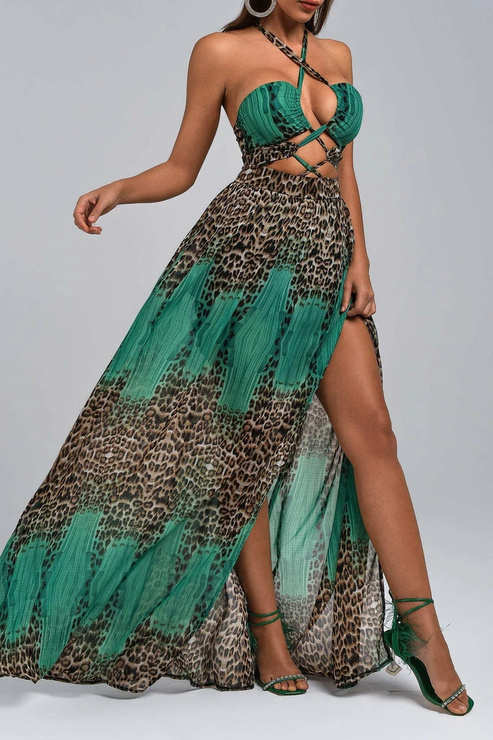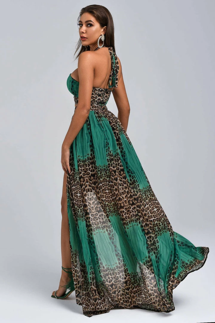 The Vix Halter Leopard Maxi Dress is sure to wow the crowd at your next special event! Comfy silks create sexy lace-ups, special rain forest hues and maxi dresses with a dazzling figure. High side seams add a sexy touch to this casual dress! Pair it with strappy heels and dazzling earrings to dazzle the crowd.