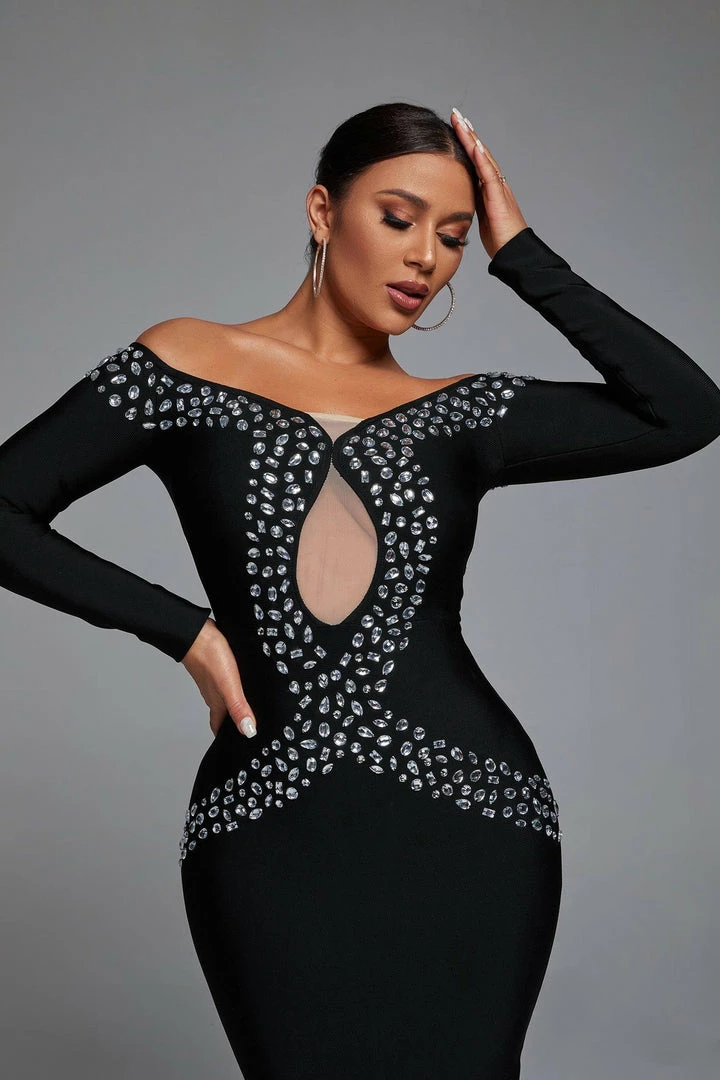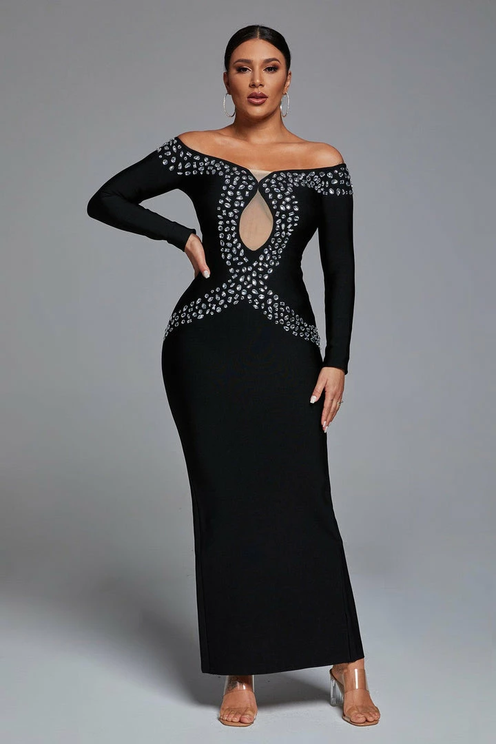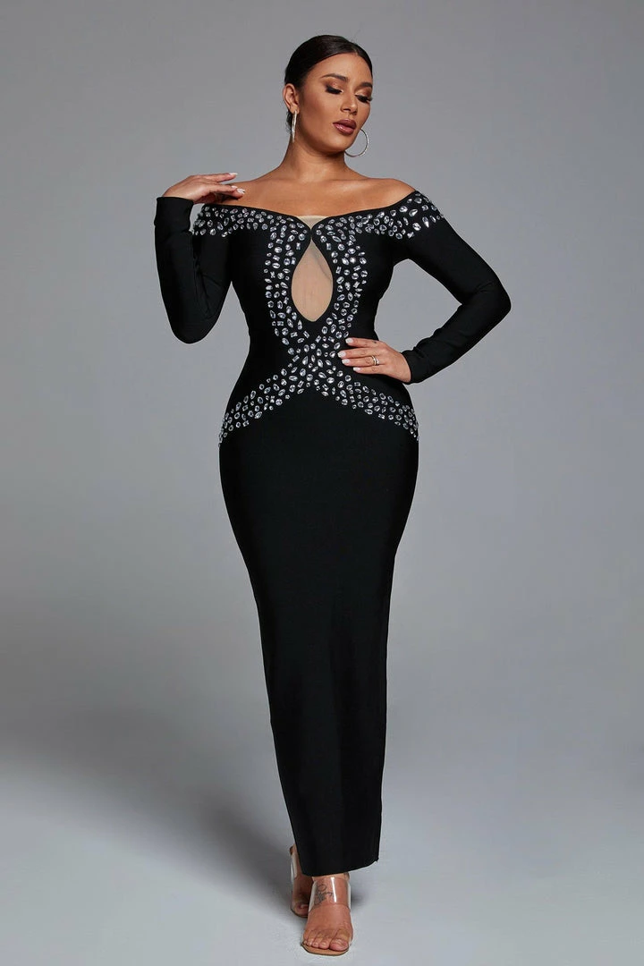 Show off your fashion forward sense and wear this glamorous style Windy Embellished Maxi Bandage Dress for your social occasion! The dress is adorn in diamonate , which makes you look shinny and charming. Stretchy bandage shapes a flirty off-the-shoulder neckline that flows into long sleeves. Maxi hem ends with a back slit.