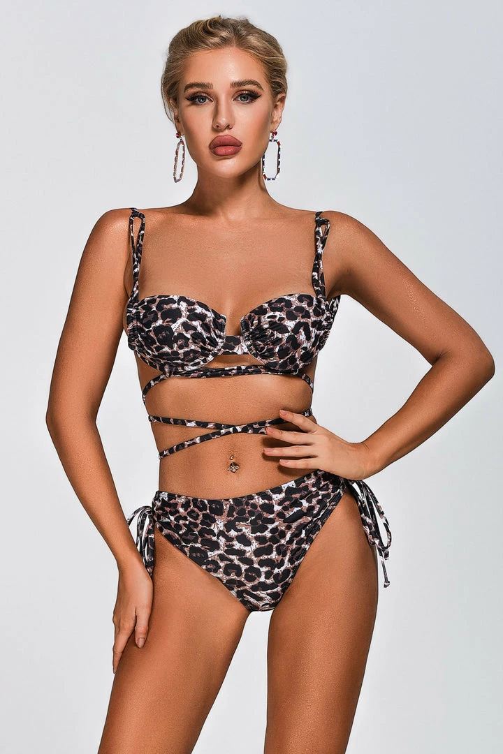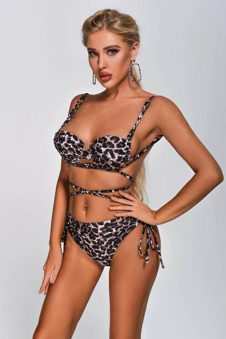 Our Alpha Leopard Bikini glowed in the sun. This style is made of our stretch fabric with a special leopard print and features an attractive triangular top with an adjustable lace-up back. It’s handcrafted, with exquisite detail. Briefs have straps on both sides to accentuate your curves. Dress for a rooftop pool party at the beach or hotel.